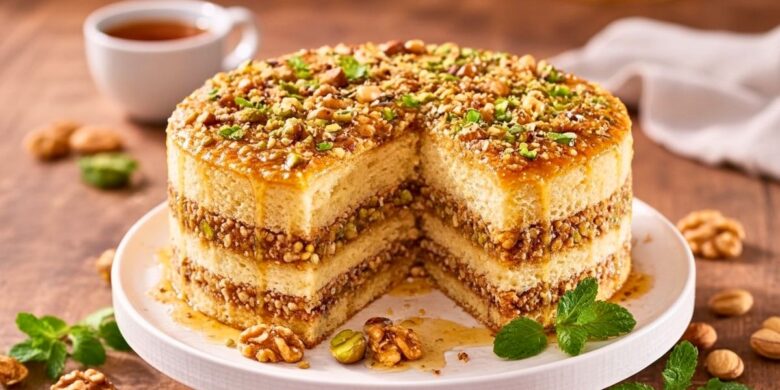 Moist Baklava Cake Recipe is a rich, nutty and sweet dessert inspired by classic baklava. It combines layers of buttery cake with cinnamon, nuts and honey syrup.